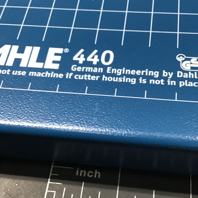 The Dahle 440 Premium Rotary Trimmer with a 14" cut length is designed for precision trimming of thicker material. It features a ground self-sharpening blade, an extruded aluminum guide bar for strength, and an automatic clamp to prevent shifting. This German engineered cutter is ultra-precise and ideal for trimming paper, cardstock, and matboard. SELF-SHARPENING